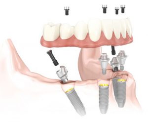 • על מערך השיניים מתפרס על גבי תשתית השתלים, בת ארבעה או שישה שתלים, מה שמאפשר חלוקה נכונה של העומס והימנעות מפגיעה בעצמות הלסת. הלחץ אשר מופעל על השתלים בהפעלת שרירי הפה מתחלק בצורה שוויונית ואופטימלית, מה שמעניק מראה שיניים סימטרי ואסתטי ותחושה נינוחה בפה.